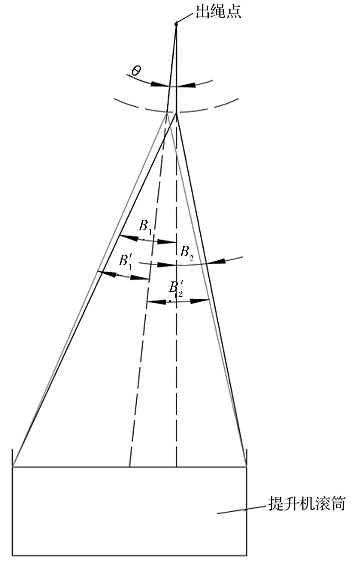 調(diào)整天輪和鋼絲繩內(nèi)外偏角的原則,需保證內(nèi)外偏角值滿足《金屬非金屬礦山安全規(guī)程》規(guī)定,同時還要確保出繩點位置不改變,即出繩點應維持在罐籠中 心位置的正上方,保證提升容器穩(wěn)定,如圖 2 所示。θ 為 1 號天輪和基座整體旋轉(zhuǎn)的角度,以出繩點為原點順時針轉(zhuǎn)動;B1 和 B2 為調(diào)整之前的內(nèi)外偏角,圖片′為調(diào)整之后的內(nèi)外偏角,2 號天輪和 1號天輪的調(diào)整方式一致,僅旋轉(zhuǎn)方向為逆時針方向。